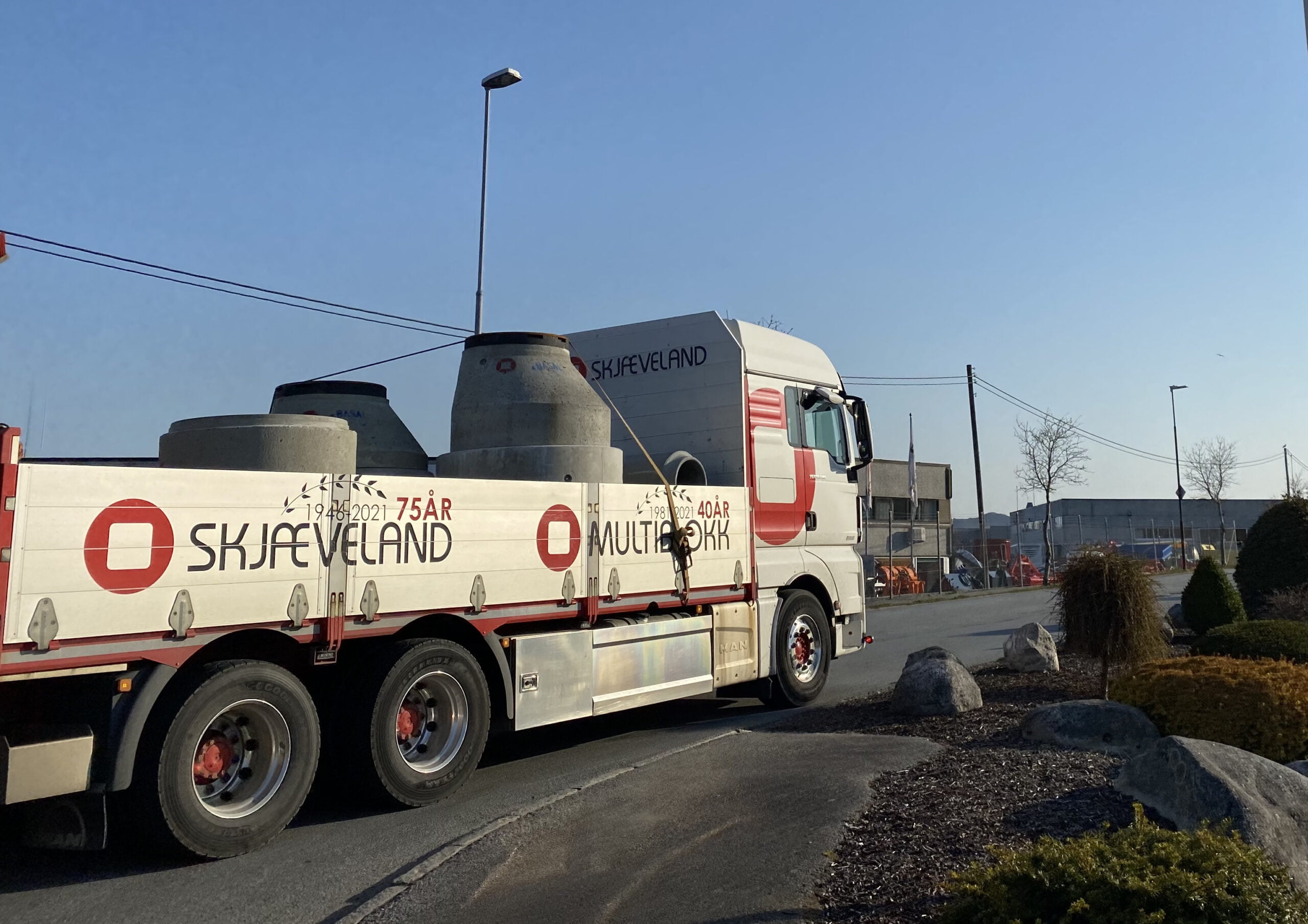 Skjæveland ble grunnlagt av Georg Hebnes, som i 1938 kjøpte en gård på Skjæveland. Familien trengte vann til fruktproduksjon. Driftige Georg Hebnes begynte å grave, men de steinsatte brønnene var ustabile, og noen raste sammen. Under arbeidet fikk han ideen til å støpe brønnringer av betong. Hebnes benyttet to forskjellige dimensjoner sildetønner og fylte betong oppi mellomrommet. Armering var piggtråd etterlatt av tyskerne … Dette ble starten på bedriften, som ble stiftet i 1946.